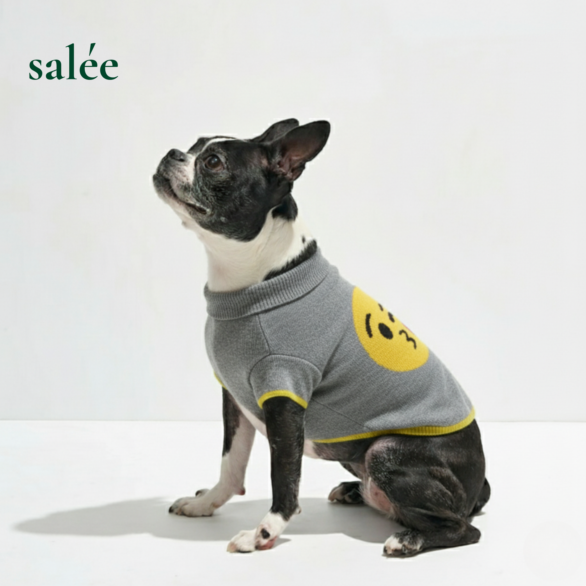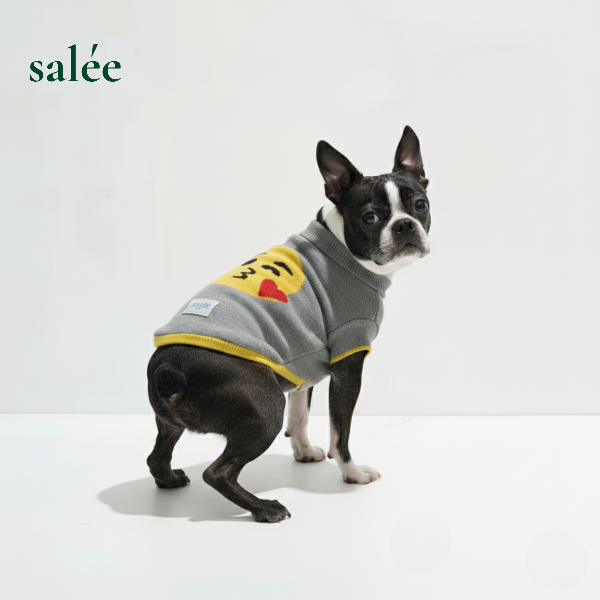 The front features a cheerful wink-and-kiss emoji intarsia in sunny yellow with a red heart, plus contrast yellow armhole trims and a Salée woven label for a clean, modern finish.