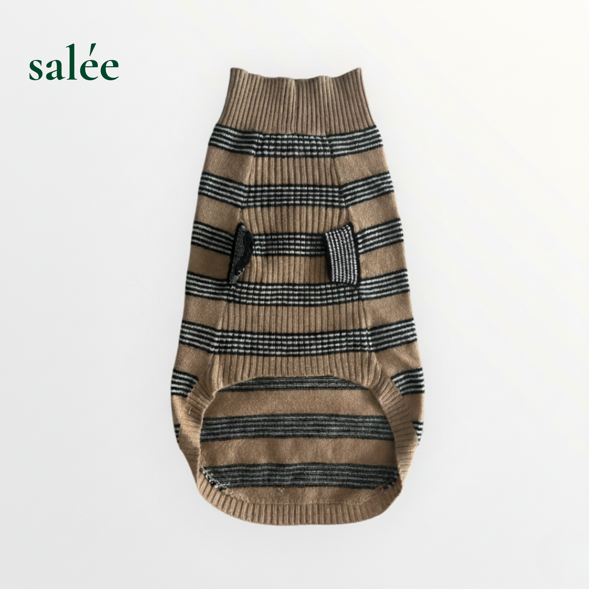 Featuring a warm camel base with black micro-stripes and fine ecru pinlines, a clean ribbed mock neck and our Salée woven label — a classic, easy look that pairs with everything.